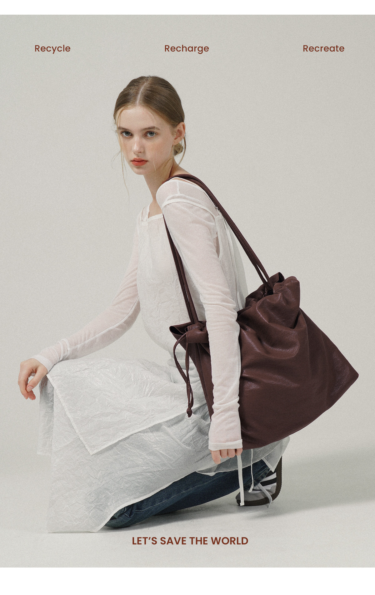 The most design-forward IT bag in the line, made from 3reminds’ signature recycled vegan leather (recycled polyester + polyurethane) — smooth, wrinkle-free, and visually indistinguishable from real leather, with a dramatically smaller footprint. The roomy W50 × H37 × D9cm body, paired with a signature drawstring closure, lets you cinch or expand your silhouette on the fly. A4 files, a 15″ laptop, gym kit — all fit. Korean fashion KOLs are calling it “2026’s smartest sustainable IT bag investment.”